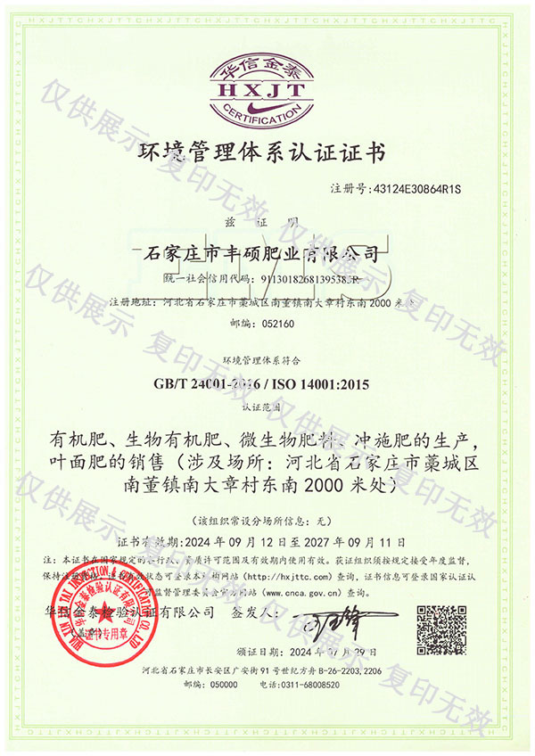 石家莊市豐碩肥業有限公司是一家集新型肥料的研發(fā)、制造、營銷、服務于一體的高新技術企業,公司自2008年創辦以來,一直致力于新型肥料的技術研發(fā)和市場推廣。公司組建了豐碩新型肥料研究中心(院士專家企業工作站),自主知識產權研發(fā)團隊專業科研人員20余人,獲得了多項肥料國家發(fā)明專利。公司目前已擁有發(fā)酵類有機肥、微生物菌劑、生物有機肥、土壤調理劑、大量元素水溶肥、含腐植酸肥料、含氨基酸肥料、中微量元素肥料等8大品類,“金維克”、“豐碩沃農”等2大自有品牌,擁有20多個暢銷品種。目前,我公司已經通過了“ISO9001 質量管理體系認證”、“ISO14001 環(huán)境管理體系認證”、“OHSAS18001 職業健康管理體系認證”。...